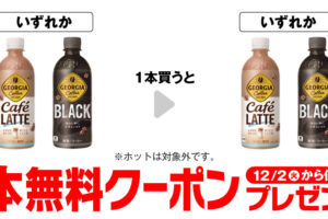 セブンイレブンは2025年11月25日〜12月1日の期間、「ジョージア カフェラテ」「ジョージア ブラック」いずれか購入で無料券をプレゼントしています。 「ジョージア カフェラテ 500ml」「ジョージア ブラック 50…