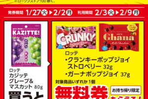 ローソンは2026年1月27日〜2月2日の期間、お菓子1個もらえるキャンペーンを実施しています。 対象商品を購入すると、無料クーポンがレシートについてきます。 <購入対象商品> ロッテ カジッテ グレープ&a…