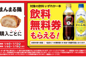 ローソンは2026年1月6日〜12日の期間、「まんまる鶏」購入ごとに対象の飲料無料券がもらえるキャンペーンを実施しています。 対象商品を購入すると、無料クーポンがレシートについてきます。 <購入商品> ・まん…