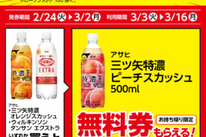 ローソンは2026年2月24日〜3月2日の期間、飲料1本もらえるキャンペーンを実施しています。 対象商品を購入すると、無料クーポンがレシートについてきます。 <購入対象商品> アサヒ 三ツ矢特濃オレンジスカッ…