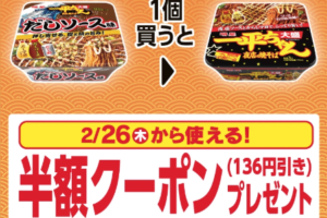 セブンイレブンは2026年2月19日〜25日の期間、「明星 一平ちゃん 夜店の焼そば大盛 だしソース味」購入で「明星 一平ちゃん 夜店の焼そば大盛」 半額レシートクーポンをプレゼントしています。 「明星 一平ちゃん 夜店…