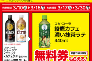 ローソンは2026年3月10日〜16日の期間、飲料1本もらえるキャンペーンを実施しています。 対象商品を購入すると、無料クーポンがレシートについてきます。 <購入対象商品> コカ・コーラ ジョージア ブラック…
