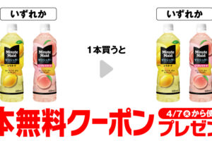 セブンイレブンは2026年3月31日〜4月6日の期間、「ミニッツメイド ゼロシュガー レモネード」「ミニッツメイド ゼロシュガー ピーチ」いずれか購入で無料券をプレゼントしています。 「ミニッツメイド ゼロシュガー レモ…
