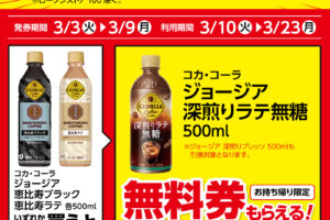 ローソンは2026年3月3日〜9日の期間、飲料1本もらえるキャンペーンを実施しています。 対象商品を購入すると、無料クーポンがレシートについてきます。 <購入対象商品> コカ・コーラ ジョージア 恵比寿ブラッ…