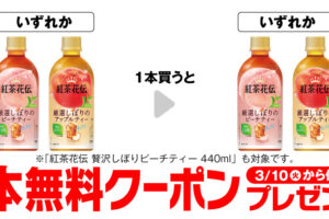 セブンイレブンは2026年3月3日〜9日の期間、「紅茶花伝 厳選しぼりのピーチティー」「紅茶花伝 厳選しぼりのアップルティー」いずれか購入で無料券をプレゼントしています。 「紅茶花伝厳選しぼりのピーチティー 440ml」…