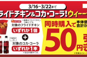 セイコーマートは2026年3月16日〜22日の期間、フライドチキン各種とコカ・コーラを一緒に買うと50円引きで販売します。 HOT CHEFの「フライドチキン」各種と、「コカ・コーラ」「コカ・コーラ ZERO」いずれかを…