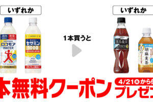 セブンイレブンは2026年4月14日〜20日の期間、「サントリー ロコモアWATER」「サントリー セサミン1000」いずれか購入で対象の飲料無料券をプレゼントしています。 「サントリー ロコモアWATER 500ml」…