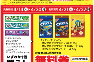 ローソンは2026年4月14日〜20日の期間、お菓子が1個もらえるキャンペーンを実施しています。 対象商品を購入すると、無料クーポンがレシートについてきます。 <購入商品> モンデリーズ・ジャパン クロレッツ…