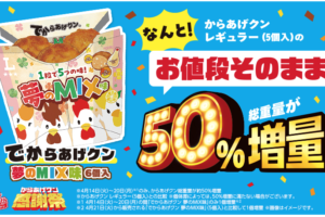 ローソンは2026年4月14日〜20日の期間、「でからあげクン 夢のMIX味」を50%増量しています。 値段はそのままで通常5個入りが6個入りになり、総重量が50%増量です。 「でからあげクン 夢のMIX味」は、衣がレギ…