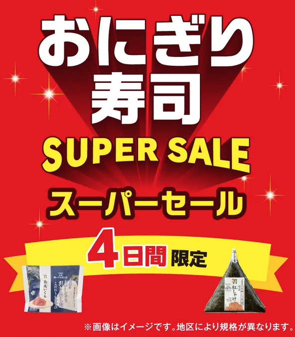 セブンイレブンは2025年6月11日〜14日の4日間、おにぎりが108円〜になる「おにぎり・寿司スーパーセール」を実施します。