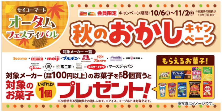 セイコーマートは2025年10月6日〜11月2日の期間、対象メーカーのお菓子累計8個購入で景品のお菓子ひとつプレゼントしています。