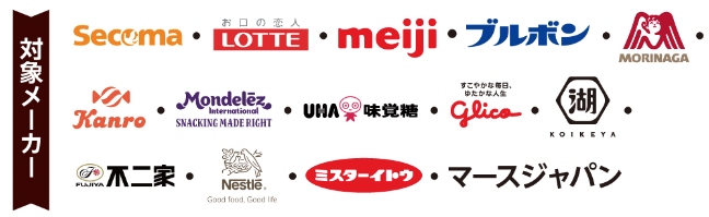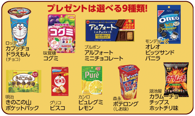対象メーカーの本体価格100円以上のお菓子を累計8個購入すると、景品のお菓子ひとつと交換できる引換券がもらえます。