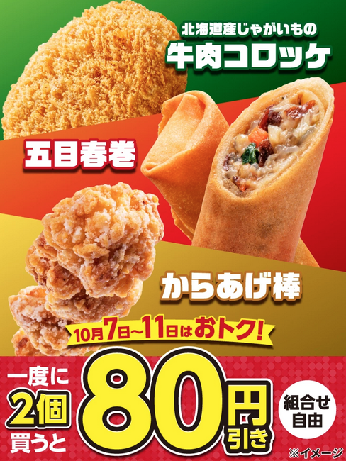 セブンイレブンは2025年10月7日〜11日の期間、北海道産じゃがいもの牛肉コロッケ・五目春巻・からあげ棒を一度に2個買うと80円引きになるセールを実施します。