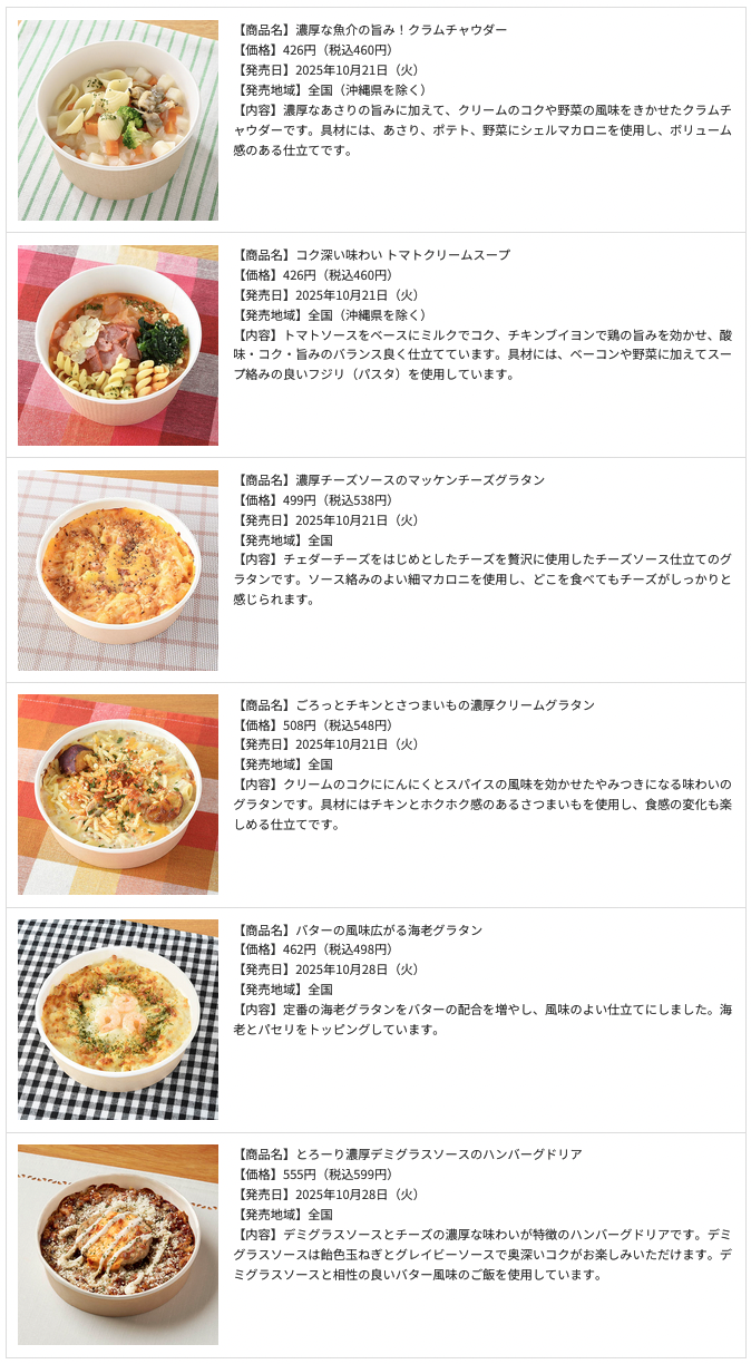 グラタンは、チェダーチーズなどの塩味、旨み、風味がきいた濃厚なチーズソースとマカロニを合わせた、チーズ好きにはたまらない「濃厚チーズソースのマッケンチーズグラタン」に、ハーブやにんにくを効かせた濃厚クリームに、チキンとさつまいものゴロっとした具材感も楽しめる「ごろっとチキンとさつまいもの濃厚クリームグラタン」をラインアップしています。