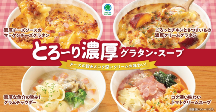 グラタンは、チェダーチーズなどの塩味、旨み、風味がきいた濃厚なチーズソースとマカロニを合わせた、チーズ好きにはたまらない「濃厚チーズソースのマッケンチーズグラタン」に、ハーブやにんにくを効かせた濃厚クリームに、チキンとさつまいものゴロっとした具材感も楽しめる「ごろっとチキンとさつまいもの濃厚クリームグラタン」をラインアップしています。
