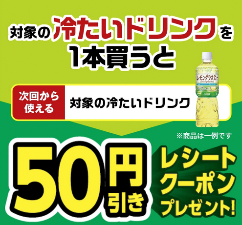 対象の冷たいドリンクを1本買うたびに、レシートに対象の冷たいドリンク50円引きクーポンが印字されます。