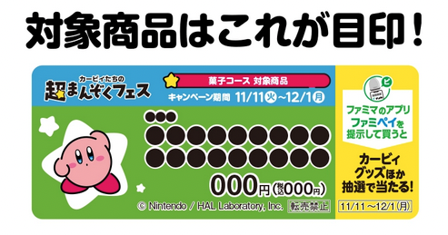 ファミリーマートは2025年11月11日10時〜12月1日の期間、対象商品2個購入で「カービィ」のオリジナルグッズをプレゼントします。