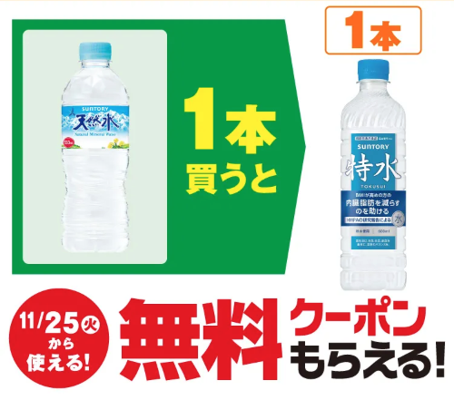 セブンイレブンは2025年11月18日〜24日の期間、アプリ限定で、「サントリー 天然水」購入で「サントリー 特水」無料券をプレゼントしています。