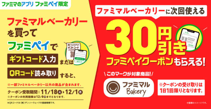 ファミリーマートは2025年11月18日〜12月1日の期間、ファミマルベーカリーを買うと30円引きクーポンをプレゼントしています。
