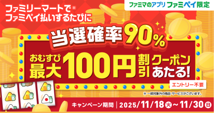 ファミリーマートは2025年11月18日〜30日の期間、ファミペイ払いするたびにおむすび割引クーポン・ファミマポイントが当たるゲームを実施しています。