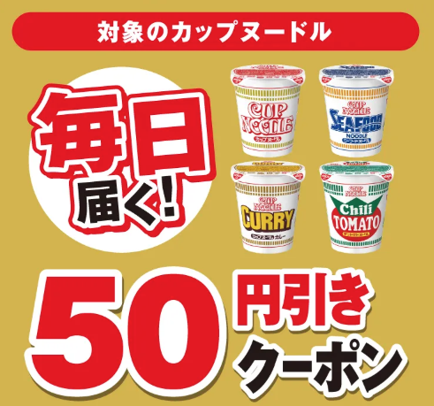 セブンイレブンは2025年11月20日〜26日の期間、アプリ限定で、対象のカップヌードル50円引きクーポンを毎日プレゼントします。