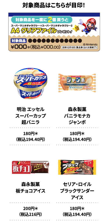 セブンイレブンは2025年11月27日10時〜12月10日の期間、対象のアイス2個購入で「スーパーマリオギャラクシー + スーパーマリオギャラクシー 2」のA4クリアファイルをプレゼントします。