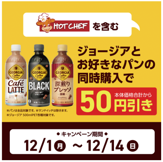 セイコーマートは2025年12月1日〜14日の期間、対象のジョージアとパン同時購入で50円引きになるキャンペーンを実施しています。