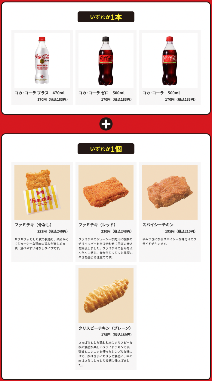 ファミリーマートは2025年12月2日〜15日の期間、対象のコカ・コーラと対象のチキンをセットで買うと100円引きキャンペーンを実施しています。