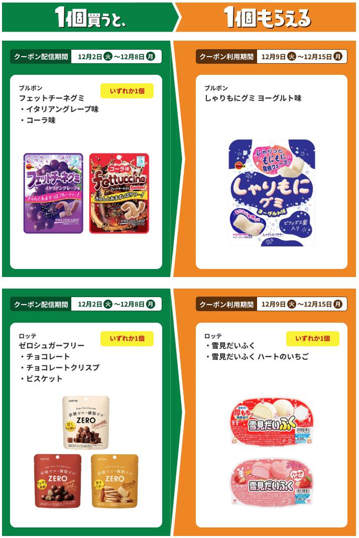 ファミリーマートは2025年12月2日〜8日の期間、1個買うと1個もらえるキャンペーンを実施しています。
