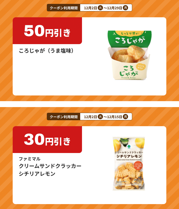 ファミリーマートは2025年12月2日より、ファミペイで期間中何度でも使えるクーポンを配信しています。