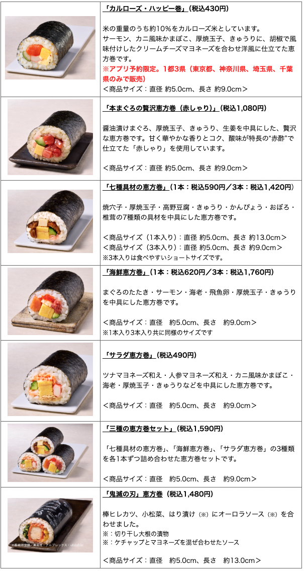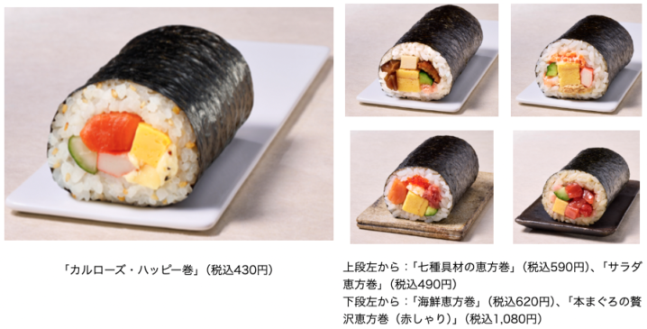 発売する恵方巻は、安価なアメリカ合衆国産のカルローズ米を使用し、お米に合う具材に見直すことなどで価格を約1割抑えた「カルローズ・ハッピー巻」、中具に本マグロを入れ赤しゃりで仕立てた「本まぐろの贅沢恵方巻(赤しゃり)」の他、定番の「七種具材の恵方巻」、「海鮮恵方巻」など計9品を発売します。
