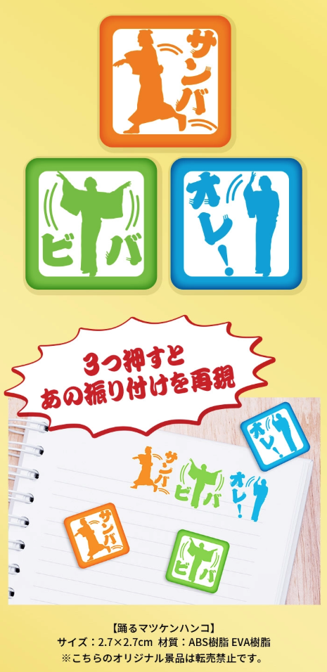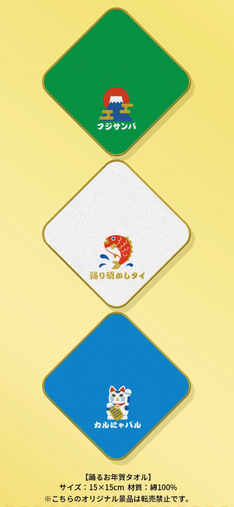 もらえるグッズは「踊るお年賀タオル」と「踊るマツケンハンコ」で、それぞれ全3種です。