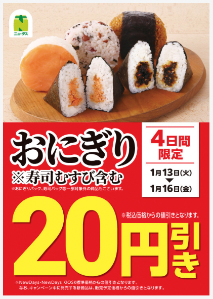 NewDaysは2026年1月13日〜16日の期間、おにぎり20円引きセールを実施します。