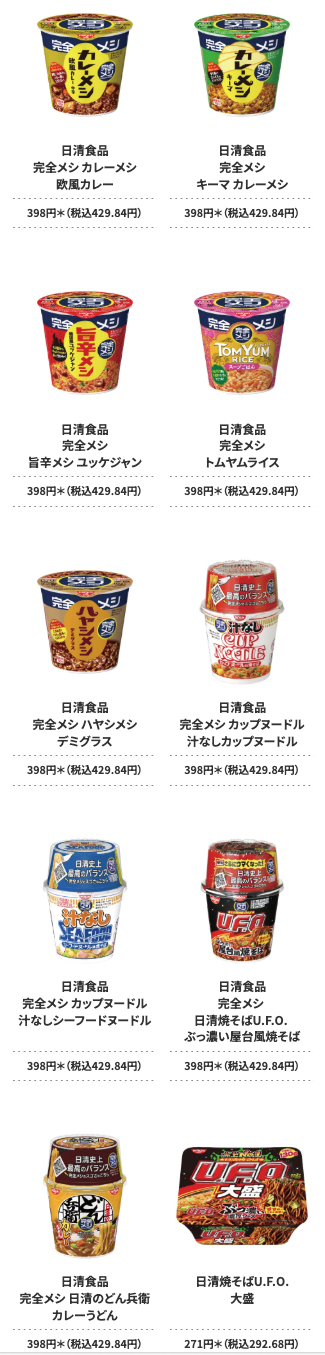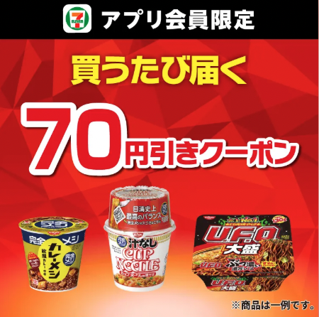 セブンイレブンアプリを提示して、対象の日清食品 完全メシ・日清焼そばU.F.O. 大盛を買うたびに、次回使える70円引きクーポンが1枚もらえます。。