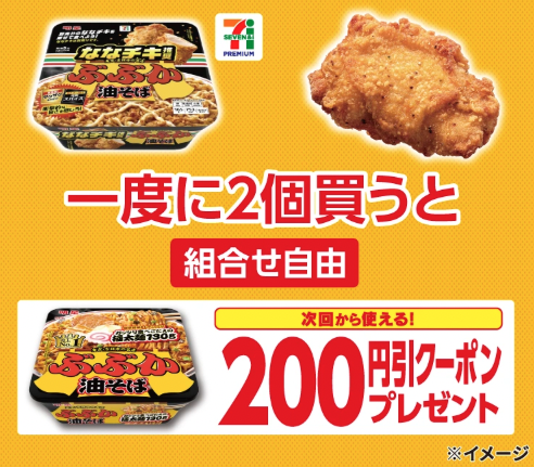 「セブンプレミアム ななチキ推奨 ぶぶか油そば」「ななチキ」を一度に2個(組合せ自由)買うと、「明星 ぶぶか油そば」200円引きレシートクーポンが1枚もらえます。
