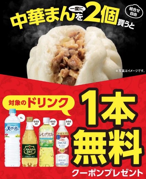 セブンイレブンは2026年1月26日〜31日の期間、中華まんを一度に2個買うと対象のドリンク1本が無料になるキャンペーンを実施します。
