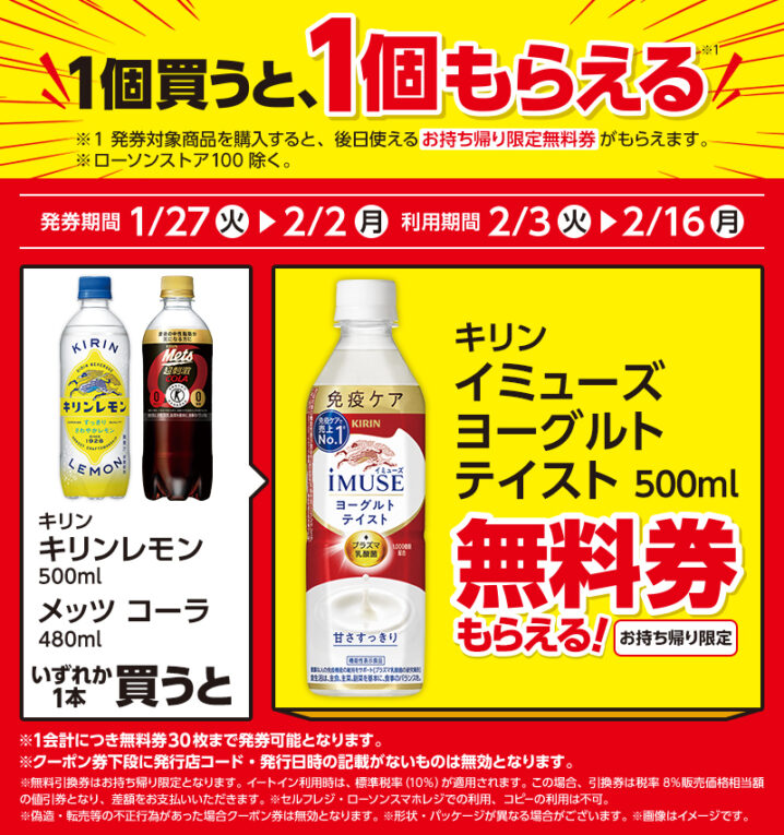 ローソンは2026年1月27日〜2月2日の期間、飲料1本もらえるキャンペーンを実施しています。