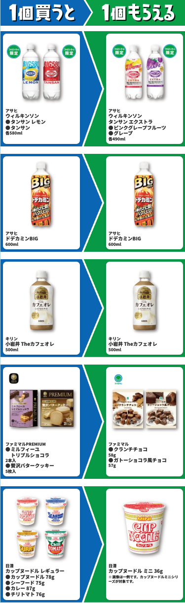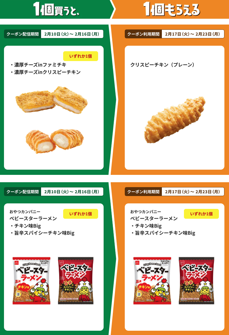 ファミリーマートは2026年2月10日〜16日の期間、1個買うと1個もらえるキャンペーンを実施しています。