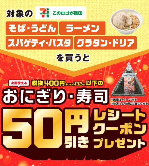セブンイレブンは2026年2月17日〜23日の期間、対象商品購入で税抜400円以下のおにぎり・寿司50円引きレシートクーポンをプレゼントします。