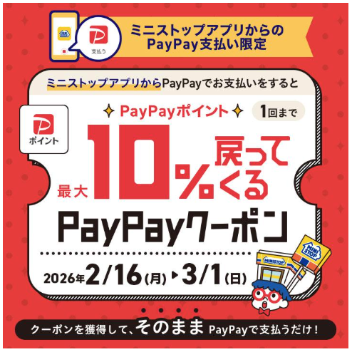 ミニストップは2026年2月16日〜3月1日の期間、ミニストップアプリ限定で、PayPayポイント最大10%戻ってくるキャンペーンを実施しています。