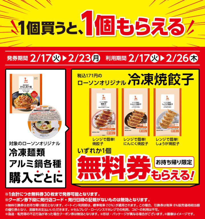 ローソンは2026年2月17日〜23日の期間、冷凍焼餃子が1個もらえるキャンペーンを実施しています。