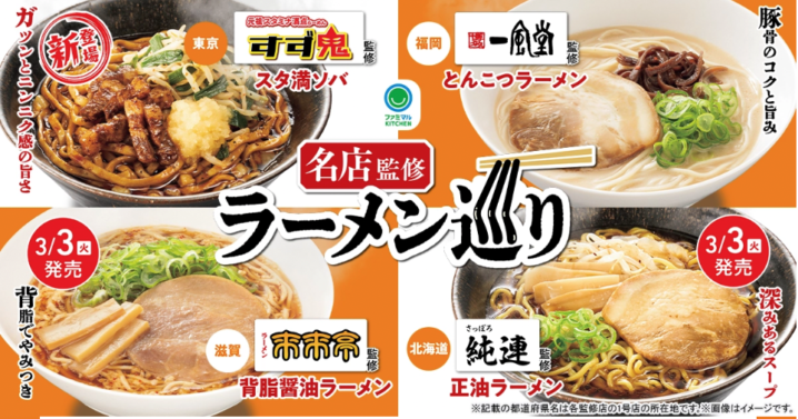 北海道から九州まで、全国各地の名店「すず鬼」「博多一風堂」「来来亭」「さっぽろ純連」の味がファミマに登場です。