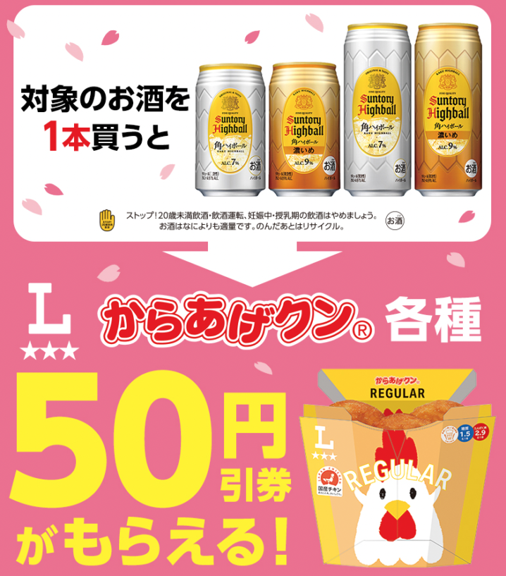 ローソンは2026年3月10日〜23日の期間、対象のお酒購入でからあげクン各種値引券がもらえるキャンペーンを実施しています。