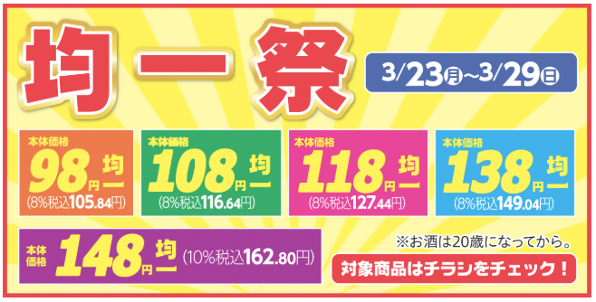 セイコーマートは2026年3月23日〜29日の期間、対象商品がお得になる「均一祭」を開催しています。