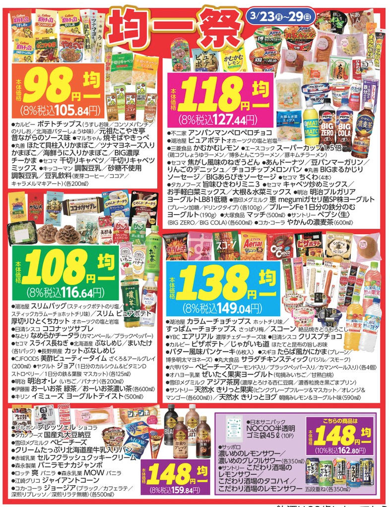 「均一祭」では菓子、飲料、カップ麺、パン、お酒などを、本体価格98円、108円、118円、138円、148円の5価格帯で提供します。(税抜価格)