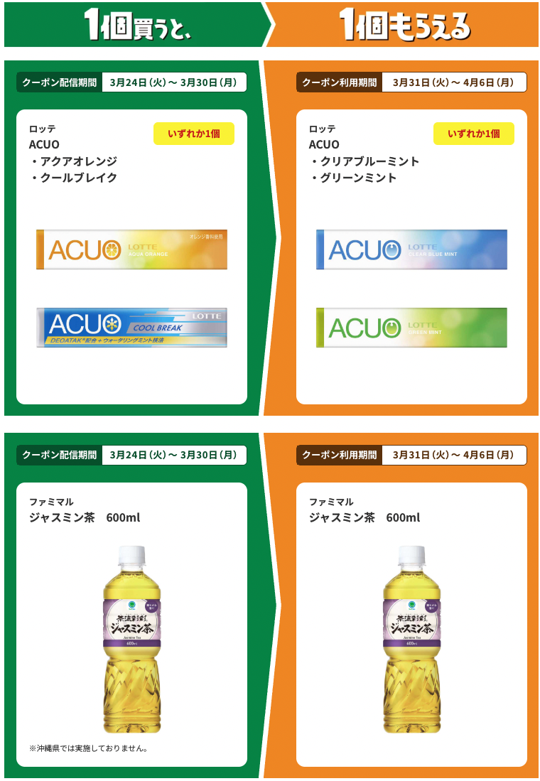 ファミリーマートは2026年3月24日〜30日の期間、1個買うと1個もらえるキャンペーンを実施しています。
