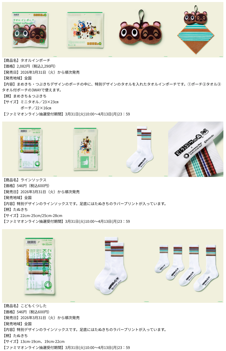 ファミリーマートは2026年3月31日より「どうぶつの森」デザインのコンビニエンスウェアを発売しています。