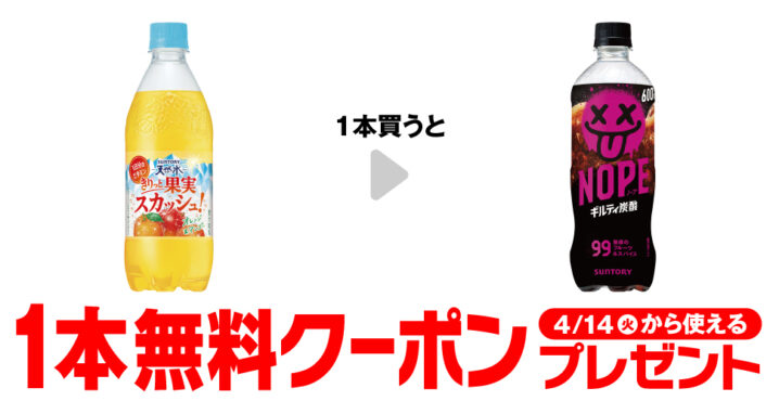 「天然水 きりっと果実 スカッシュ 500ml」を購入すると、「サントリー NOPE 600ml」と交換できるレシートクーポン(無料引換券)が発行されます。