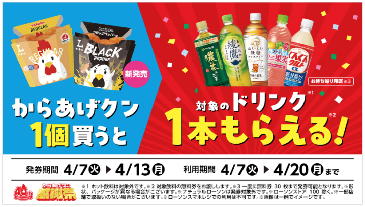 ローソンは2026年4月7日〜13日の期間、からあげクン1個購入ごとに飲料無料券がもらえるキャンペーンを実施しています。