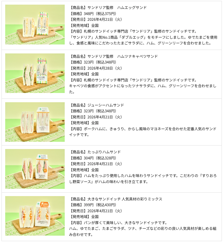 「サンドリア監修 ハムエッグサンド」「サンドリア監修 ハムツナキャベツサンド」や、ハムを使用した定番のサンドイッチのリニューアル商品など5種類を発売です。